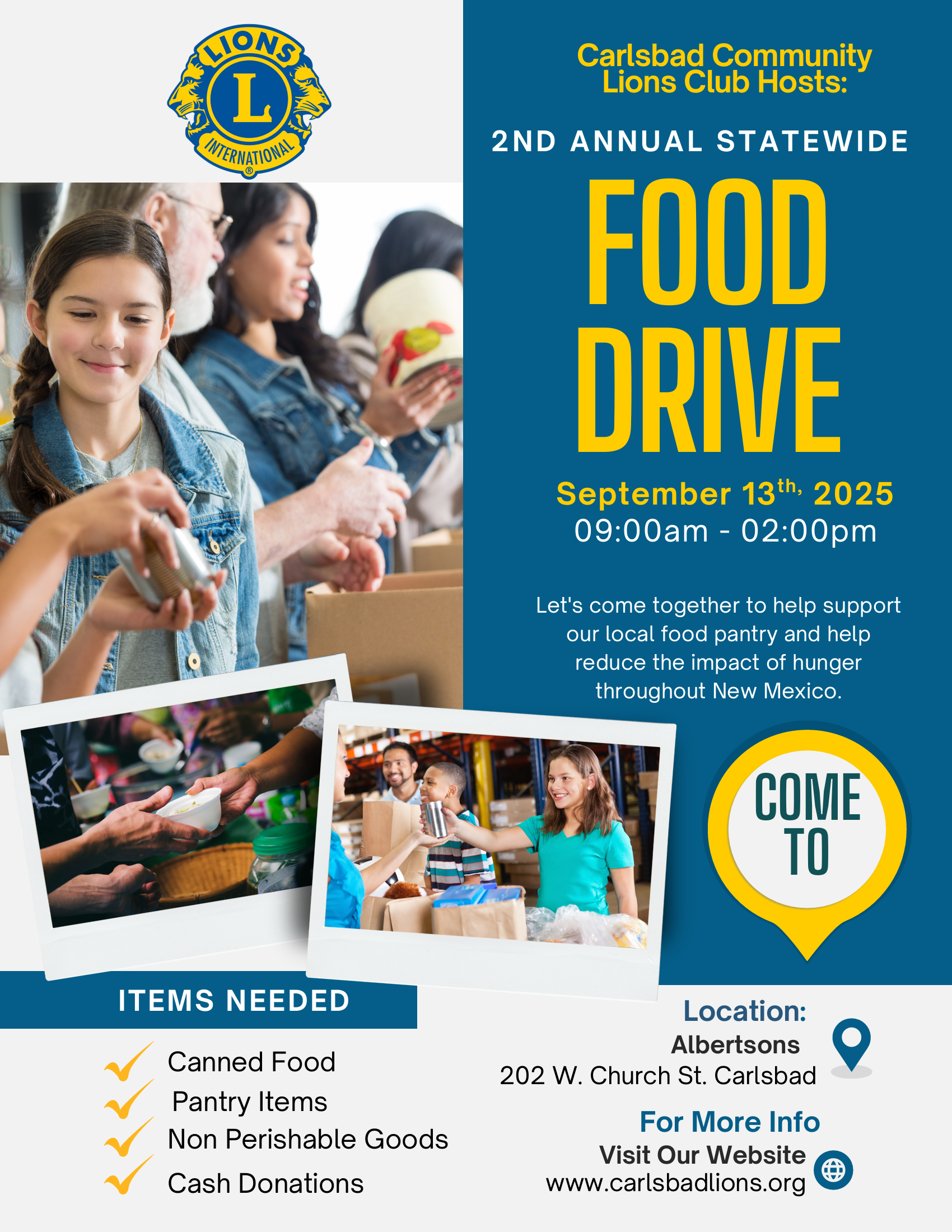 Food Drive Saturday, September 13, 2025 9:00 AM 10:00 AM Albertsons 202 West Church Street Carlsbad, NM, 88220 United States (map) Google Calendar ICS